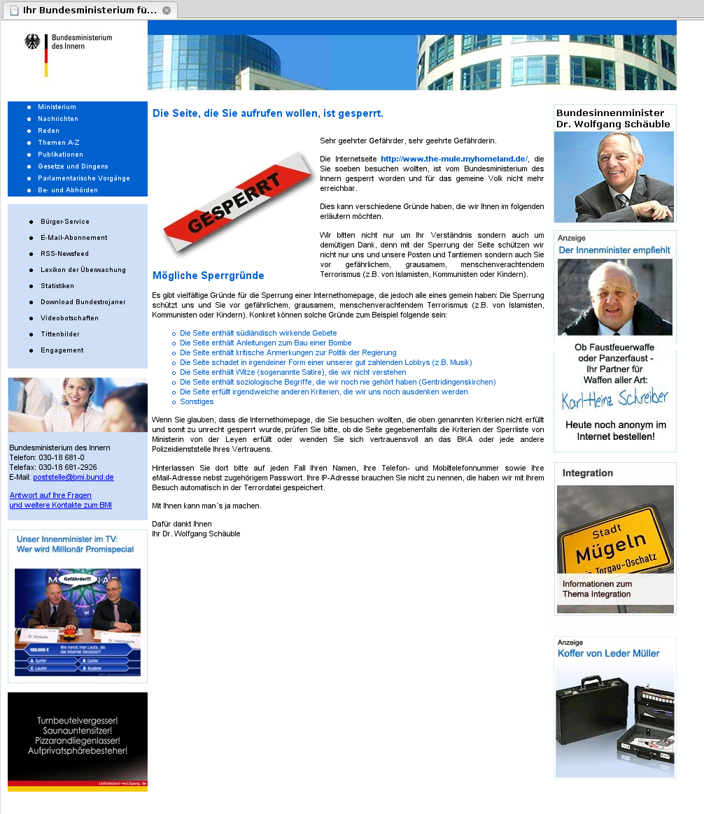 Die Webseite war eine Satire zu Netzsperren. Im Stil der Internetseite des Bundesinnenministeriums wurde den Besuchern verkündet, dass die hier gehostete Webseite gesperrt sei. Unter anderem wegen „südländisch wirkender Gebete“ und „kritischer Anmerkungen zur Bundesregierung“ (siehe Screenshot). Aus Spaß wurde jedoch Ernst: Die Webseite verschwand aus dem Netz.