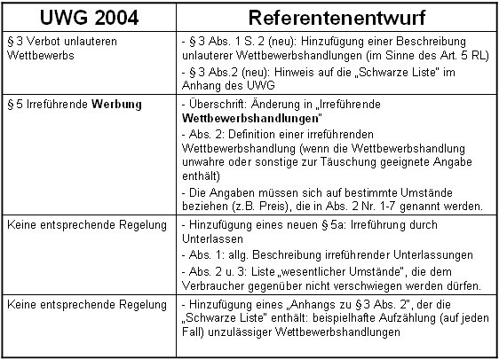 Die unmittelbare Anwendung der Richtlinie kann und darf natürlich nur eine Übergangslösung sein. Am 27. Juli dieses Jahres wurde ein Referentenentwurf veröffentlicht, der versucht, das aktuelle UWG an die Richtlinie anzupassen. Die Tabelle zeigt eine grobe Übersicht der geplanten Änderungen.