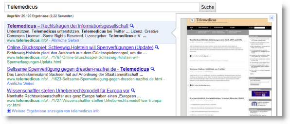 Manchmal hat man den Eindruck, dass Google ein Gespür dafür hat, den Finger in die Wunden des deutschen Medienrechts zu legen. Neuestes Beispiel: „Instant Preview”, die neue Vorschaufunktion, die Google gestern vorgestellt hat. Neben den Suchergebnissen will Google künftig Screenshots der gefundenen Seiten anzeigen, um den Nutzern einen schnelleren Eindruck der gelisteten Webseiten zu ermöglichen.
