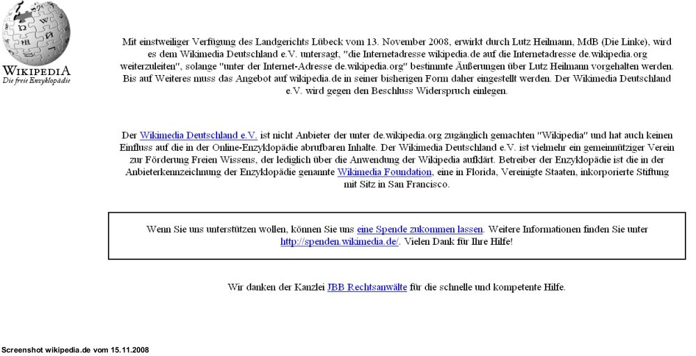 Wikipedia.de verlinkt nicht mehr auf die Wikipedia: Statt dessen steht dort nur ein Text, in dem auf eine Einstweilige Verfügung des LG Lübeck verwiesen wird. Wie ist es dazu gekommen? Wir erklären die rechtlichen und sachlichen Hintergründe.