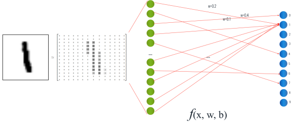 Im einfachsten Falle werden die Zahlen, die die einzelnen Pixel darstellen („x“), mit einer Zufallszahl („w“) multipliziert. Gegebenenfalls wird noch eine zweite Zahl („b“) addiert. Dann wird vielleicht das Ergebnis zwischen 0 und 9 skaliert (im oben genannten Beispiel). Im gezeigten Bild zeigen die meisten Ergebnisse auf „1“. Das bedeutet, das die Wahrscheinlichkeit, dass es sich um eine „1“ handelt, am größten ist.
