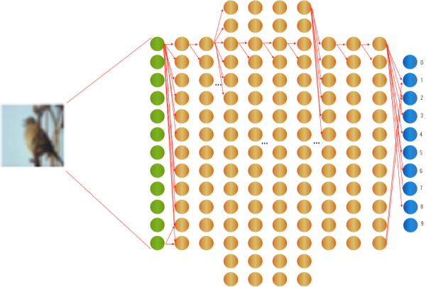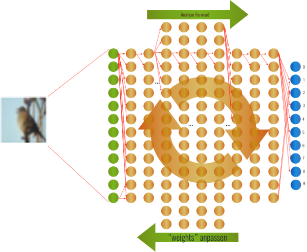 Nachdem die Daten eines jeden einzelnen Bildes (vereinfacht dargestellt) bei den blauen Kreisen („Output Nodes“) als ein Ergebnis angekommen sind, wird analysiert, ob es als „bird“ („2“) erkannt wurde. Wenn dies nicht mit 100%-iger Sicherheit erfolgte, wenn also als Daten auch andere blaue Kreise („Output-Nodes“) ankamen, werden die „weights“ („w“) angepasst und das ganze nochmals durchgeführt.