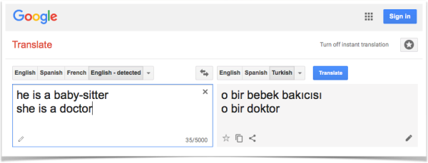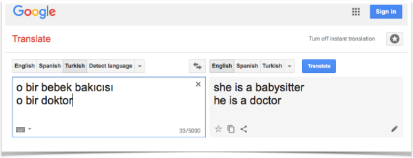 Der Hintergrund ist, dass es im Türkischen keine Geschlechter (er/sie/es) gibt, sondern nur ein „o“ (für er/sie/es). Man könnte jedoch aus dieser Übersetzung schließen, dass nur Männer Ärzte sein können und Babysitter nur Frauen. Hier wäre eine bessere Analyse der Trainingsdaten und Erstellung eines neuen Wortes im Englischen (he_she) besser gewesen, denn es gibt viele Sprachen, die keine Geschlechterunterscheidung haben.