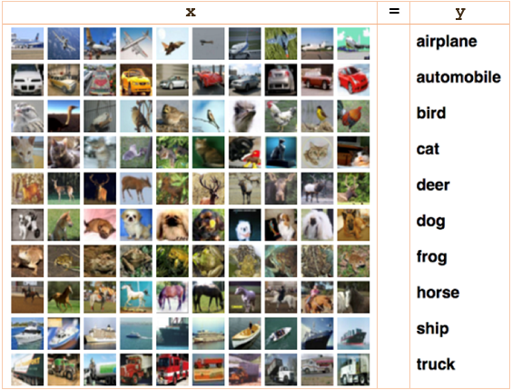 Die Spalte „y“ können auch mit Zahlen dargestellt werden („0=airplane“, „1=automobile“, „2=bird“, usw.) Ob Zahlen oder Text ist dabei nicht relevant.