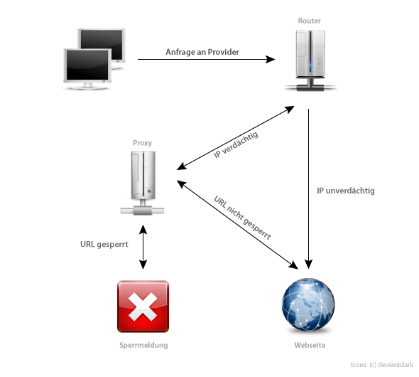 Erhält der Proxy-Server eine Anfrage vom Provider prüft er, ob die angefragte Seite gefiltert werden soll oder nicht. Ist die Seite gesperrt, liefert er eine Fehlermeldung aus, bzw. verweigert die Auslieferung der Seite. Andernfalls ruft er die Webseite auf und leitet sie an den Provider zurück, der sie wiederum an seinen Kunden weiterreicht.