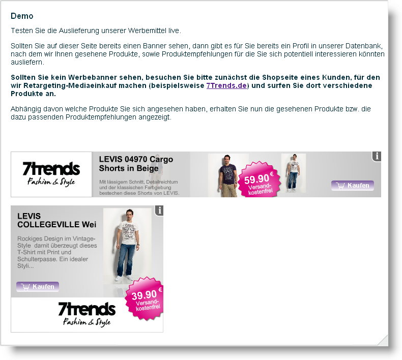 Der Besuch der Website einer Werbeagentur (nach eigenen Angaben „Deutschlands erster Spezialvermarkter“ in Bezug auf „Retargeting”) veranschaulicht ganz praktisch, dass das Prinzip tatsächlich funktioniert: Man surfe von dort aus auf die Seiten der aufgeführten Referenzkunden, beschäftige sich etwas mit den einzelnen Produkten, und kehre dann zurück auf die Website der Agentur. Auf der dort bereitgestellten Demo-Fläche wird dann umfänglich Werbung für Produkte dargestellt, die man kurz zuvor so oder ganz ähnlich sich auf den Webseiten der Referenzkunden angesehen hatte.