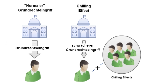 Bei Chilling Effects ist die Konstellation eine anderere: Bürger A hat ein Grundrecht, der Staat greift in dieses Grundrecht ein – aber die Maßnahme ist grundsätzlich gerechtfertigt, weil A nicht über die Maßen betroffen ist. Weil aber neben A noch viele andere Bürger die konkrete Maßnahme als Chilling Effect spüren, sind deren legitime Interessen (bzw. das Interesse der Allgemeinheit am unbefangenen Verhalten dieser Bürger) in die Verhältnismäßigkeitsprüfung mit einzustellen. Und erst dadurch wird die staatliche Maßnahme unverhältnismäßig.