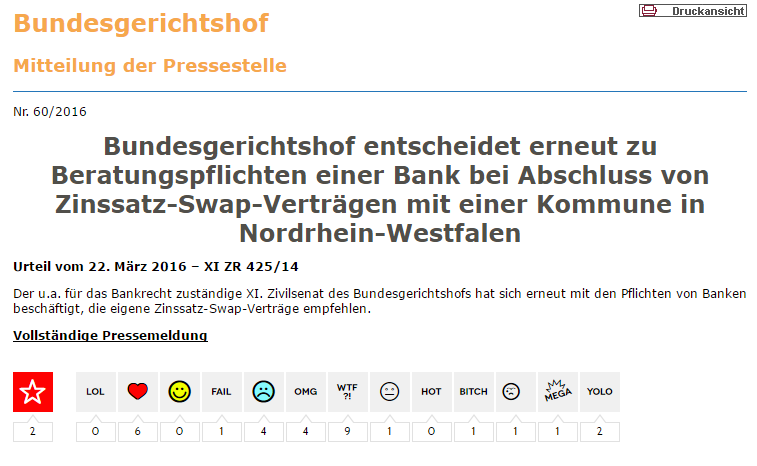 Der Bundesgerichtshof hat heute ein neues Bewertungssystem für Urteile eingeführt. Künftig sollen Bürger Entscheidungen des BGH direkt auf dessen Webseite nach verschiedenen Kategorien bewerten können. Der BGH erhofft sich von dieser Evaluation eine bessere Einschätzung, wie die Urteile von Deutschlands höchstem ordentlichen Gericht in der Bevölkerung wahrgenommen werden. Ob die Bewertungen auch Einfluss auf interne Personalentscheidungen beim BGH haben sollen, ist derzeit noch unklar.