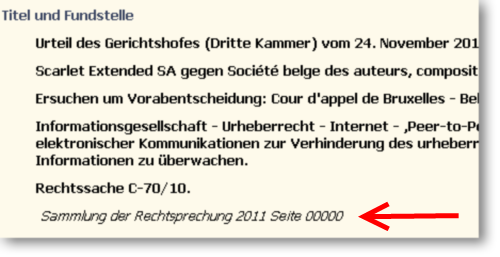 Auch der EuGH selbst verweist in seinen Entscheidungen mit Vorliebe auf die Fundstellen aus der eigenen, offiziellen Sammlung. Die Verwiese sehen dann z.B. aus wie dieser hier, der aus der aktuellen Scarlet Extended-Entscheidung stammt: