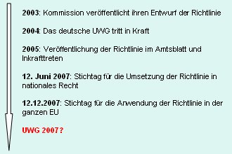 Die Richtlinie über unlautere Geschäftspraktiken war noch nicht in trockenen Tüchern, als der deutsche Gesetzgeber im Jahr 2004 die Novellierung des „Gesetzes gegen den unlauteren Wettbewerb“ (UWG) beschloss. Die Richtlinie sollte nicht abgewartet werden.