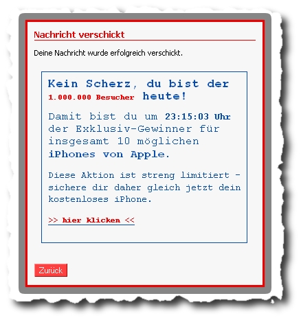 „Kein Scherz, du bist der 1.000.000 Besucher heute! Damit bis du […] der Exklusiv-Gewinner für insgesamt 10 möglichen [sic!] iPhones von Apple.“