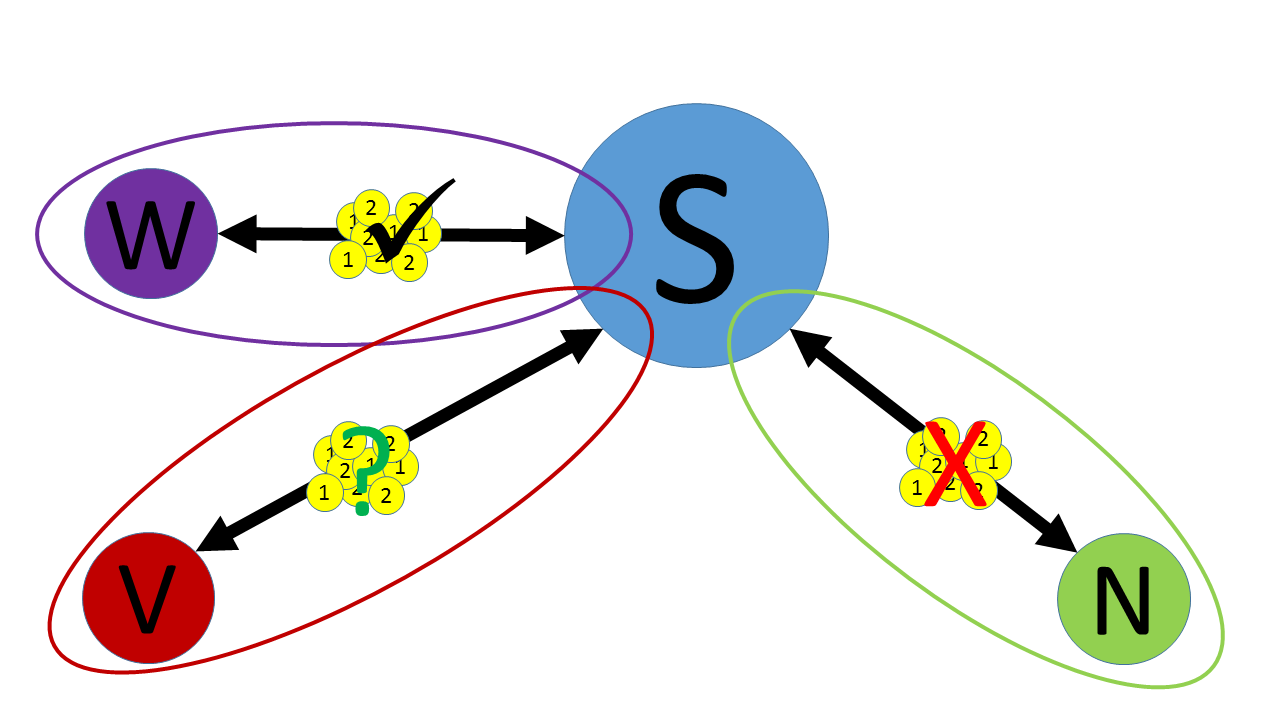 Der Suchmaschinen-Betreiber tritt in diesem Beispiel gegenüber drei Gruppen auf. Erstens gibt es die Gruppe der Internetnutzer, die auf einer Suchmaschine Begriffe eingeben und Ergebnisse angezeigt bekommen (S-N). Zweitens gibt es die Gruppe der Inhalteanbieter oder hier Verlage, deren Inhalte die Suchmaschine erfasst, nach Suchbegriffen indiziert und den Internetnutzern bei passenden Suchbegriffen anzeigt (S-V). Drittens taucht die Gruppe der Werbeunternehmen auf, die auf der Seite des Seitenbetreibers Werbung schalten können (S-W). Daneben können je nach Geschäftsmodell weitere Gruppen hinzukommen.