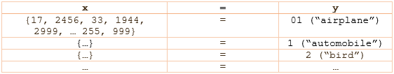 Die Spalte „y“ können auch mit Zahlen dargestellt werden („0=airplane“, „1=automobile“, „2=bird“, usw.) Ob Zahlen oder Text ist dabei nicht relevant.