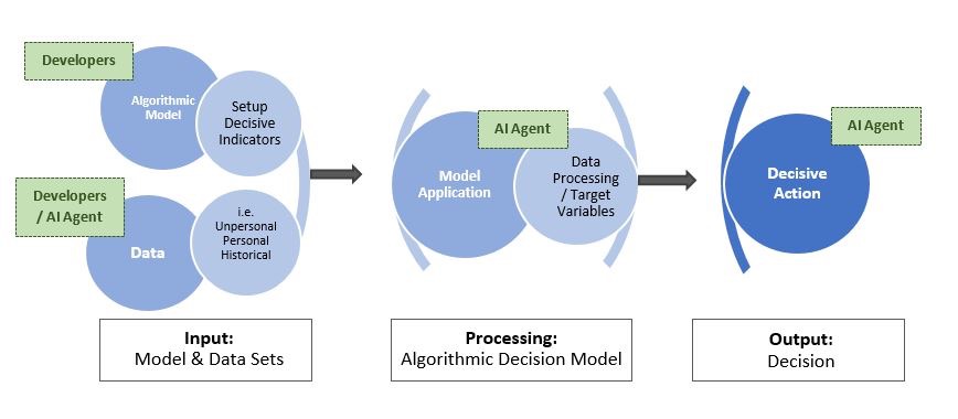 Below figure exemplarily illustrates a basic ADM scenario where the decision is solely being made by the algorithm (AI Agent). The basic ADM process can be clustered into three main phases. During the input phase, the algorithmic model programmed by developers is being set up, plus, relevant data sets are being selected by developers and deployed by the AI Agent. In the subsequent processing phase, the developed model is being applied by processing data against defined target variables for the decision’s subject. In the final output phase, the AI agent is taking the decision based on the created output.