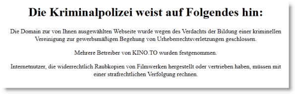 Letzte Woche hat die Staatsanwaltschaft Dresden zum großen Schlag gegen kino.to ausgeholt. Einige mutmaßliche Betreiber wurden verhaftet, die Domain gesperrt. Bevor die Seite endgültig vom Netz ging war auf kino.to eine Warnung der Kriminalpolizei zu lesen:
