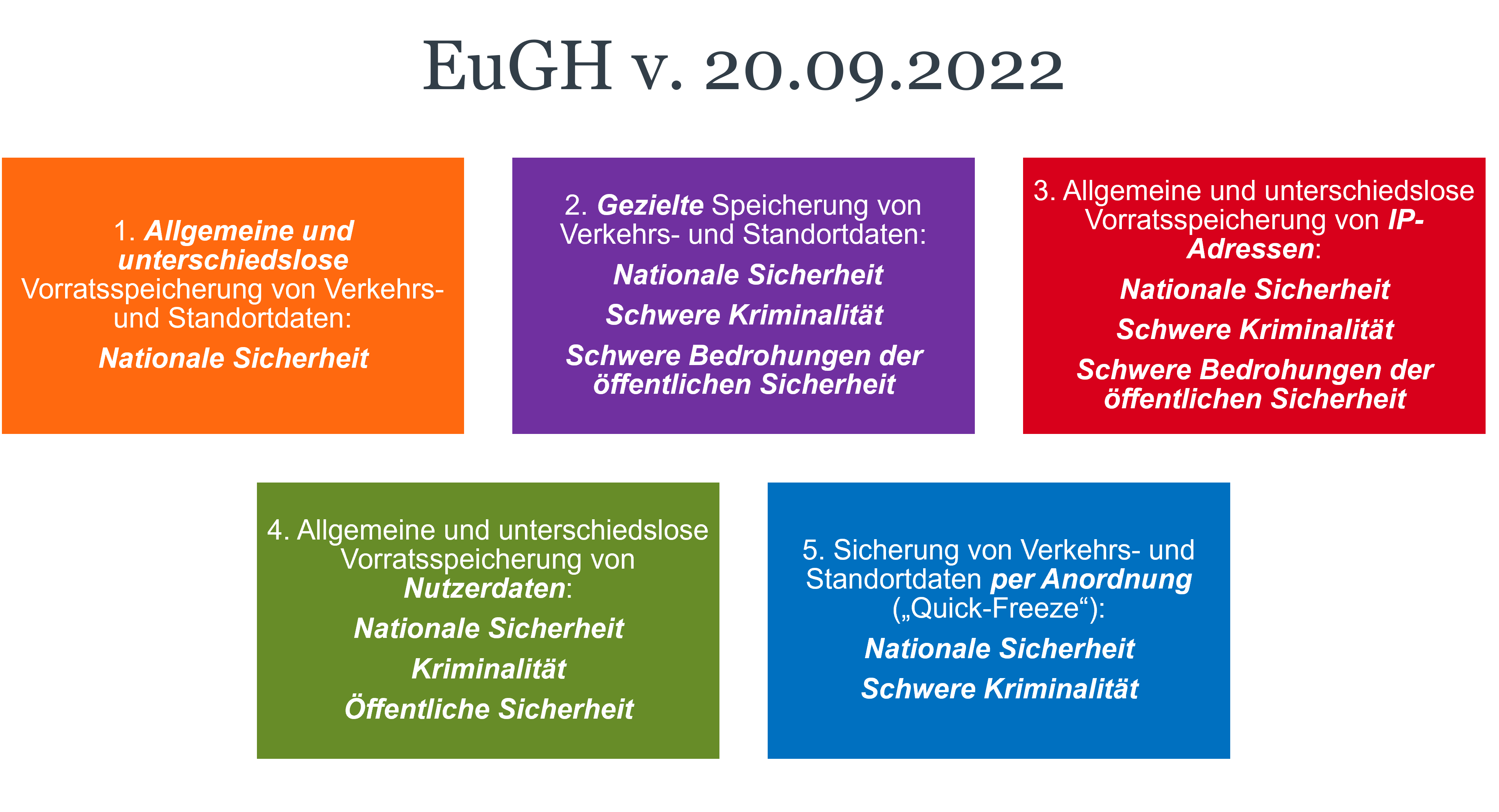 Der EuGH bestätigte am 20. September 2022 (Az. C-793/19 und C-794/19) seine Rechtsprechungslinie aus 2016 und 2020: Grundsätzlich dürften mitgliedstaatliche Normen keine „allgemeine und unterschiedslose Vorratsspeicherung von Verkehrs- und Standortdaten“ vorsehen. Dennoch bestehe ein Spielraum für die Regelung einer Vorratsspeicherung unter bestimmten Voraussetzungen: