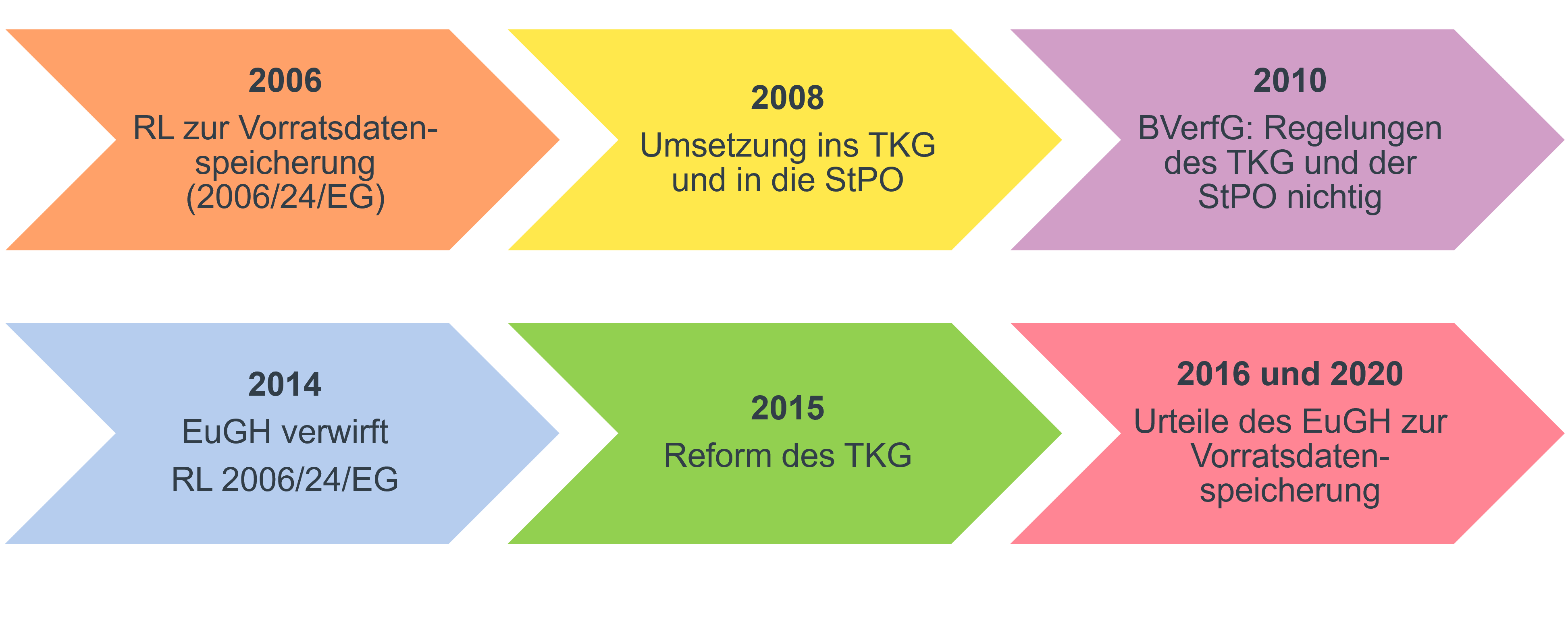 Die rechtliche Auseinandersetzung mit dem Thema reicht schon einige Jahre zurück: 2006 erließ die EU die Richtlinie zur Vorratsdatenspeicherung (RL 2006/24/EG). Deutschland setzte die Richtlinie 2008 im nationalen TKG und im Fachrecht (insb. in der StPO) um. Ab diesem Zeitpunkt bestand für deutsche TK-Anbieter eine Pflicht, bestimmte Daten anlasslos für bis zu sechs Monate zu speichern.