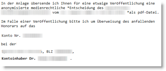Doch damit nicht genug: Für einige Richter scheinen die eigenen Urteile sogar ein willkommener Nebenverdienst zu sein. Uns sind einige Fälle bekannt, in denen Richter ihre eigenen Entscheidungen bei diversen Fachzeitschriften und Online-Diensten einsenden. „Mit der Bitte um Überweisung des Veröffentlichungshonorars“ – auf das private Bankkonto.